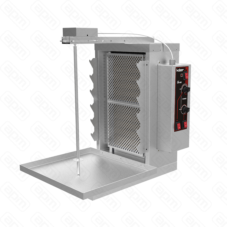 Гриль для шаурмы КОБОР GM-2E предназначен для жарки мясной начинки из курицы, свинины, говядины за счет тепла, выделяемого нагревательными элементами. Производит обжарку мясного филе, подготовленного согласно соответствующей рецептуре и размещенного на вертикальный вертел, который вращается около нагревательных элементов (ТЭНов) до его готовности.