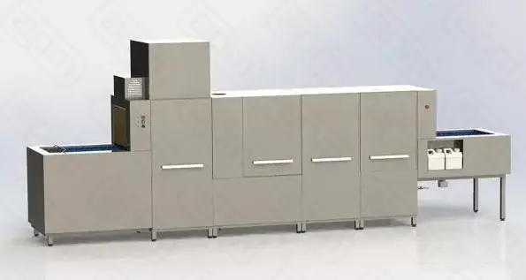 Мощность 43,5 кВт. Производительность (по тарелкам ø240 мм) 1600шт./час. Габаритные размеры (д/ш/в) 4760х890х1930 мм.