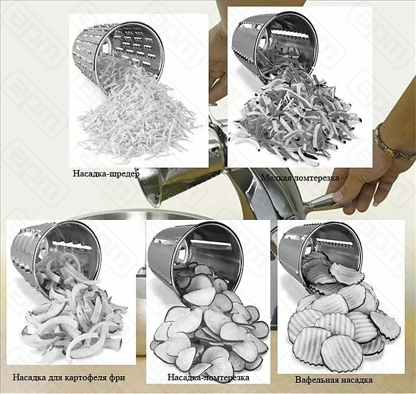 – Насадка-шредер для твёрдых продуктов (свёкла, морковь, картофель).