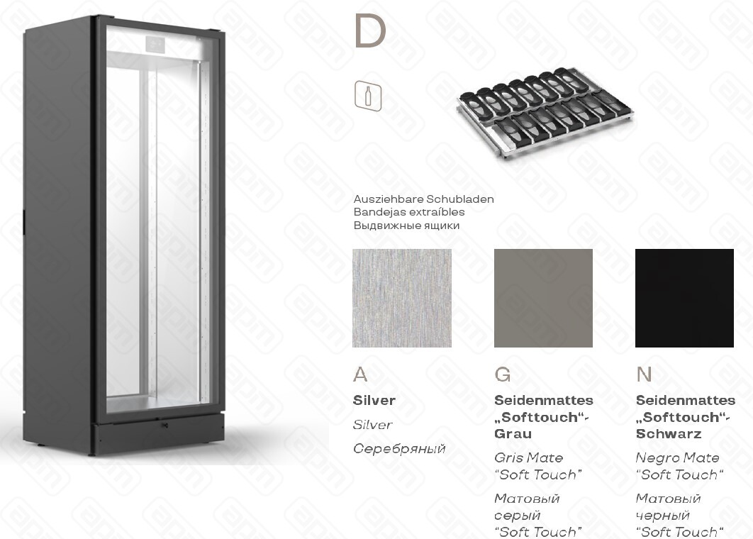 — В комплекте 14 полок типа D (выдвижные, для горизонтального размещения бутылок, вместимость 14 бутылок)