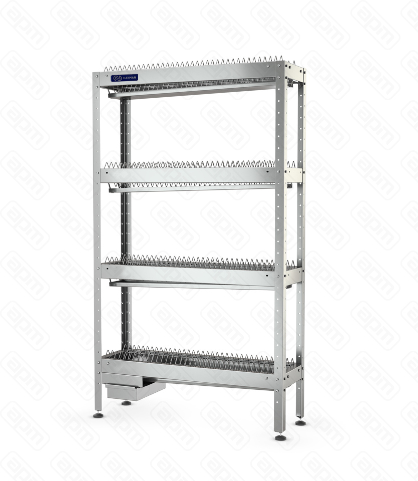 Стеллаж выполнен из пищевой нержавеющей стали. Он состоит из четырёх полок, закрепленных на стойках и кассет, уложенных на полках. Кассета представляет собой решётку из прутка, в ячейки которой помещаются тарелки. Под каждой полкой установлен сливной лоток для сбора жидкости. В лотке предусмотрен небольшой уклон, обеспечивающий сток жидкости, поступающей с мокрой посуды к сливному отверстию. В нижней части стеллажа устанавливается накопитель для сбора воды со всех кассет. Ножки имеют пластиковую опорную часть и регулируются по высоте. Изделия разборные и поставляются в удобной упаковке.