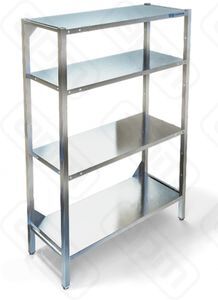 — Стойки изготовлены из трубы, нержавеющая сталь AISI 430, 40х40 мм. — Полки сплошные из нержавеющей стали AISI 430 толщиной 0,8 мм. — Шаг регулировки высоты полок - 100 мм. — Нагрузка на каждую полку не более 150кг, при этом не более 400 кг на весь стеллаж. — Стеллаж имеет разборную конструкцию и состоит из четырёх стоек и четырёх полок. — Универсальная конструкция позволяет легко производить сборку стеллажей. — Ножки стеллажа снабжены регуляторами высоты, что позволяет устранять неровности пола. — Дополнительные конструктивные элементы предназначены для предотвращения раскачивания и придают большую устойчивость стеллажу.