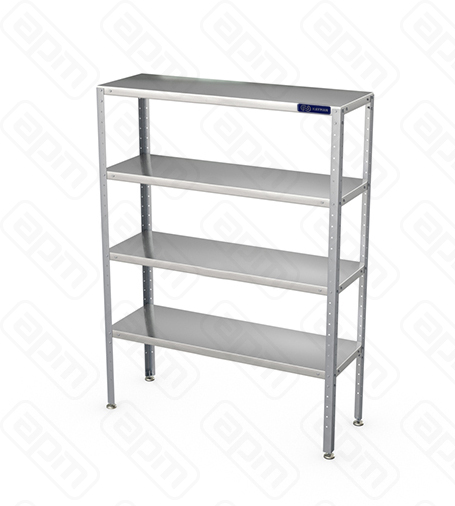 Стеллаж состоит их четырех полок и четырех стоек. Стойки стеллажа изготавливаются из оцинкованной стали. Полки выполнены из пищевой нержавеющей стали и могут устанавливаться на разных уровнях. Ножки имеют пластиковую опорную часть и регулируются по высоте. Изделия разборные и поставляются в удобной упаковке.