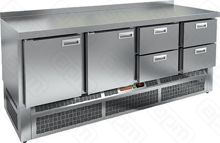 Конструкция стола включает в себя стальную столешницу, четырехсекционную морозильную камеру.