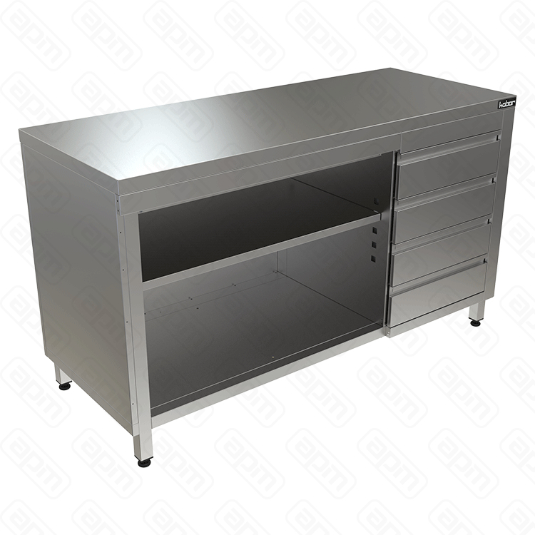 — Каркас стола: разборный из нержавеющей стали AISI 430 — Материал столешницы: нержавеющая сталь AISI 430 — Усиление ЛДСП — Полка — 4 выдвижных ящика — Распашные двери — Без борта — Разборный