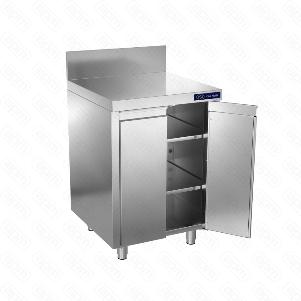 600х600х870мм, 1 борт, высота борта 150мм, нагрузка на столешницу 100кг, нагрузка на полку 30кг. Столешница нерж. сталь AISI430 0,8мм, подложка столешницы ДСП 16мм. 2 распашные двери. Двери, боковые панели и столешница выполнены из нержавеющей стали AISI430. Дно и задняя стенка выполнены из оцинкованной стали. В комплект стола входят 2 полки, усиленные ребром жесткости. Наличие полки позволяет увеличить полезное пространство в столе размещая на ней посуду, инвентарь, столовые приборы и сухие виды продуктов. Регулируемые ножки 20мм. Вес 45кг.