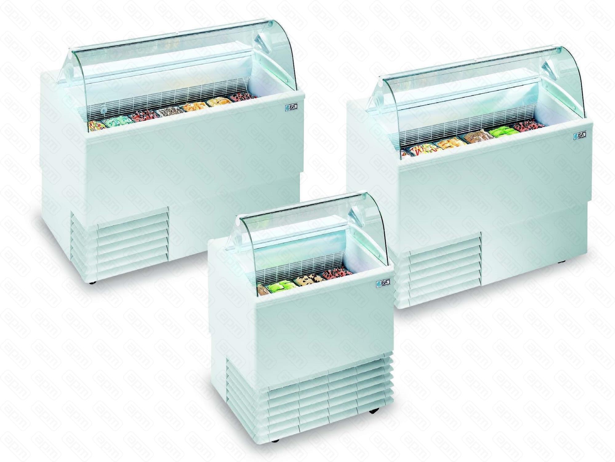 1184x800x1176мм, 0,81кВт, 220В, 97 кг. Цвет отделки Белый, вместимость 6(+6) емкости по 5 л (360х165х120 мм), резервный отсек для хранения запаса, температурный дипазон -20...-10C. Стеклянная надстройка с гнутым стеклом, поворотная крышка-дверца, охлаждение статическое, автоматическая оттайка. Климатический класс 7 (Т до 35C, влажность до 75%), хладагент R290